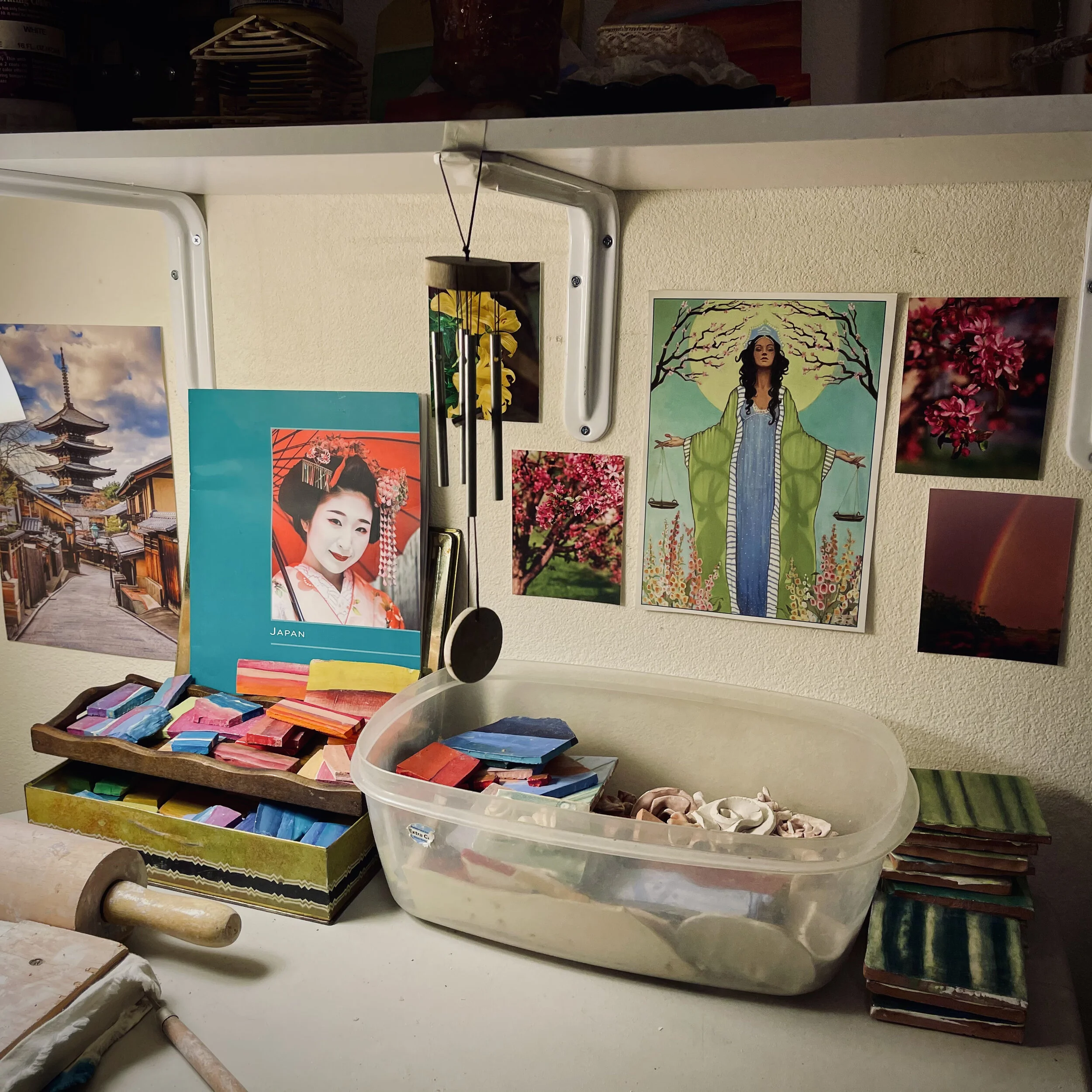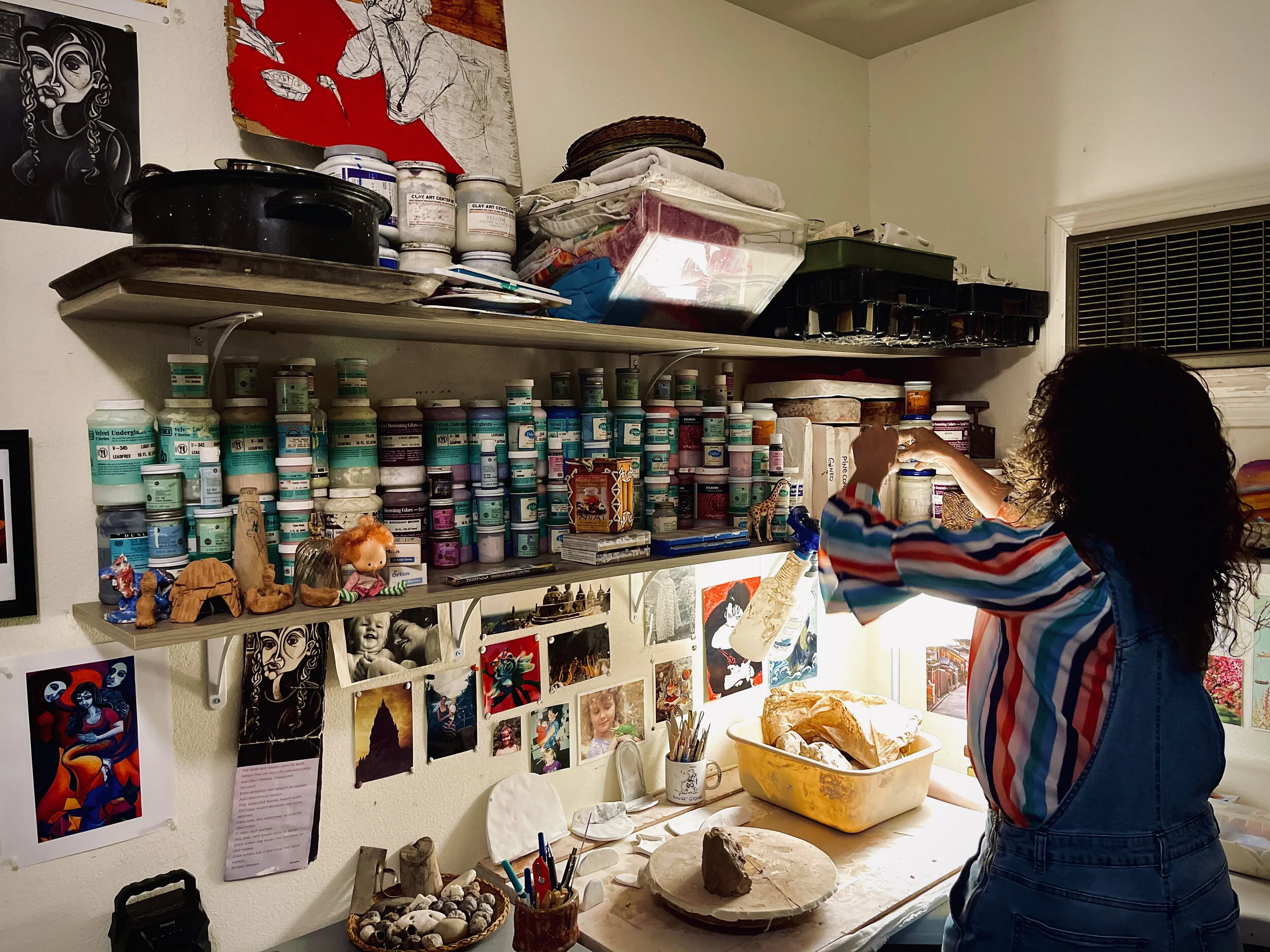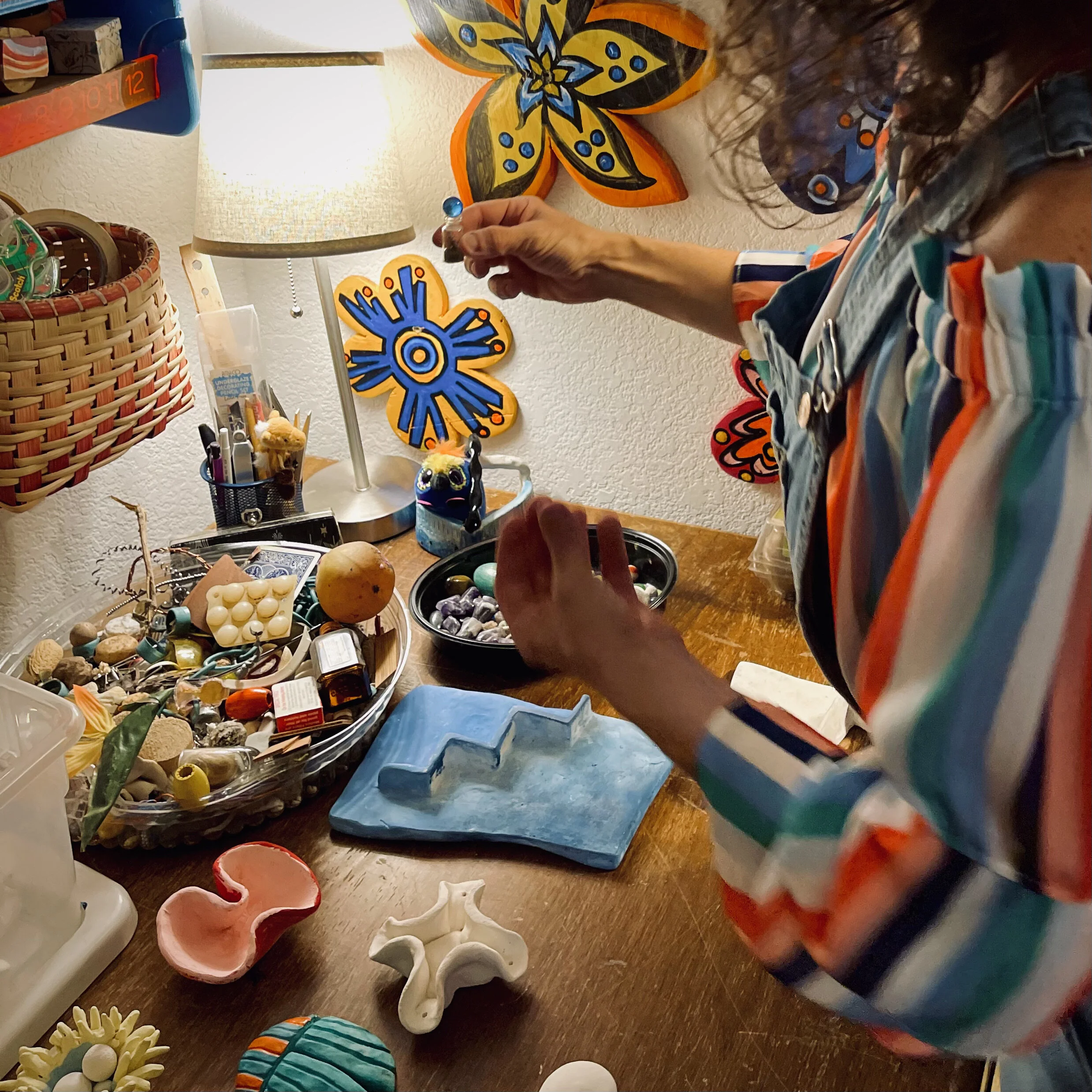 All these little found objects that I have picked up through my travels I definitely have to have. I don’t necessarily use them all the time. I have used them like when I was first making shrine-like pieces. For me it’s really inspiring just playing around with them and I’ll make a clay piece that reminds me of it. If I don’t know what to make, I can dig in here and it’s like my own mini sandbox. I have packed and traveled with these things in like four different states.