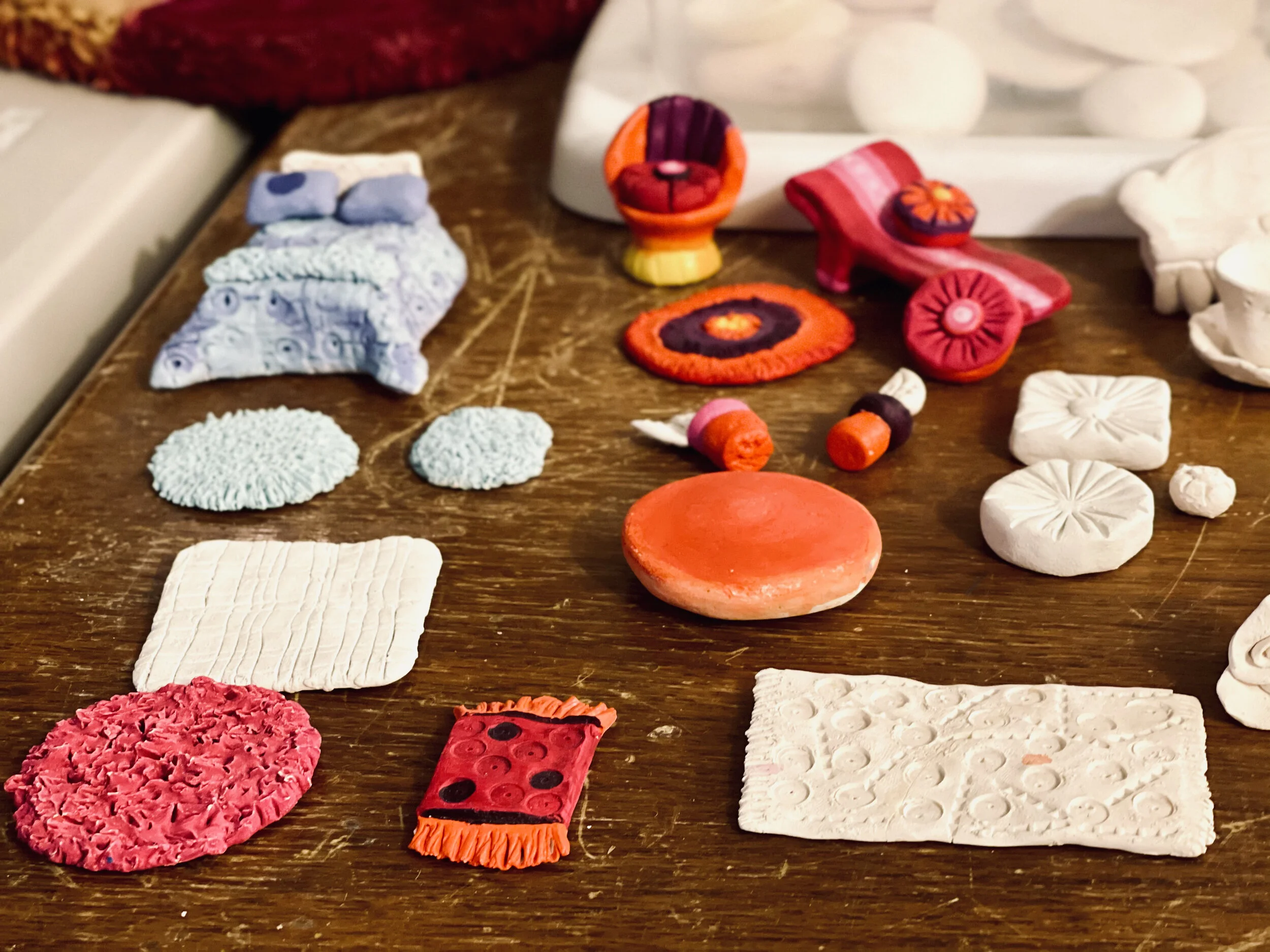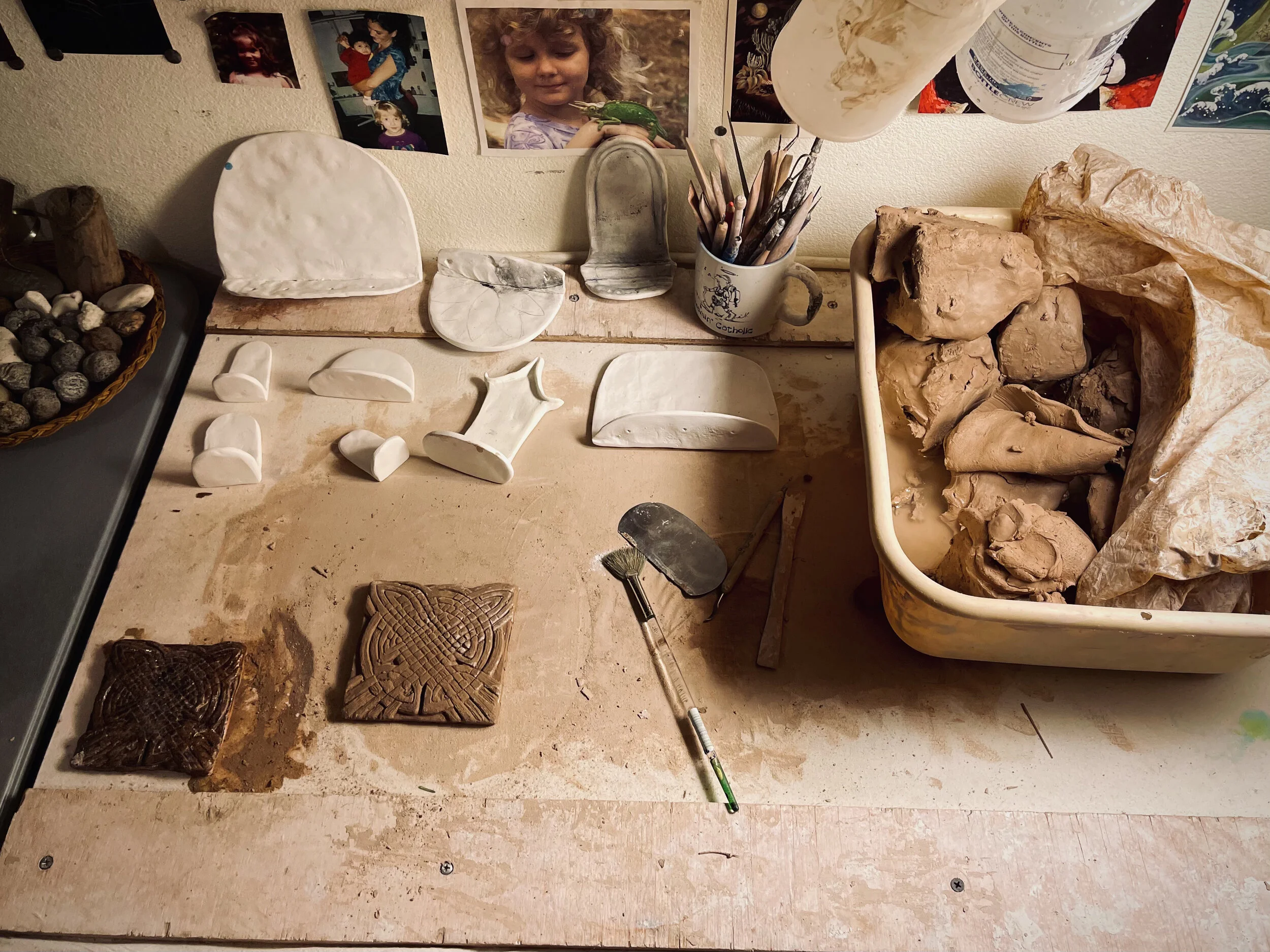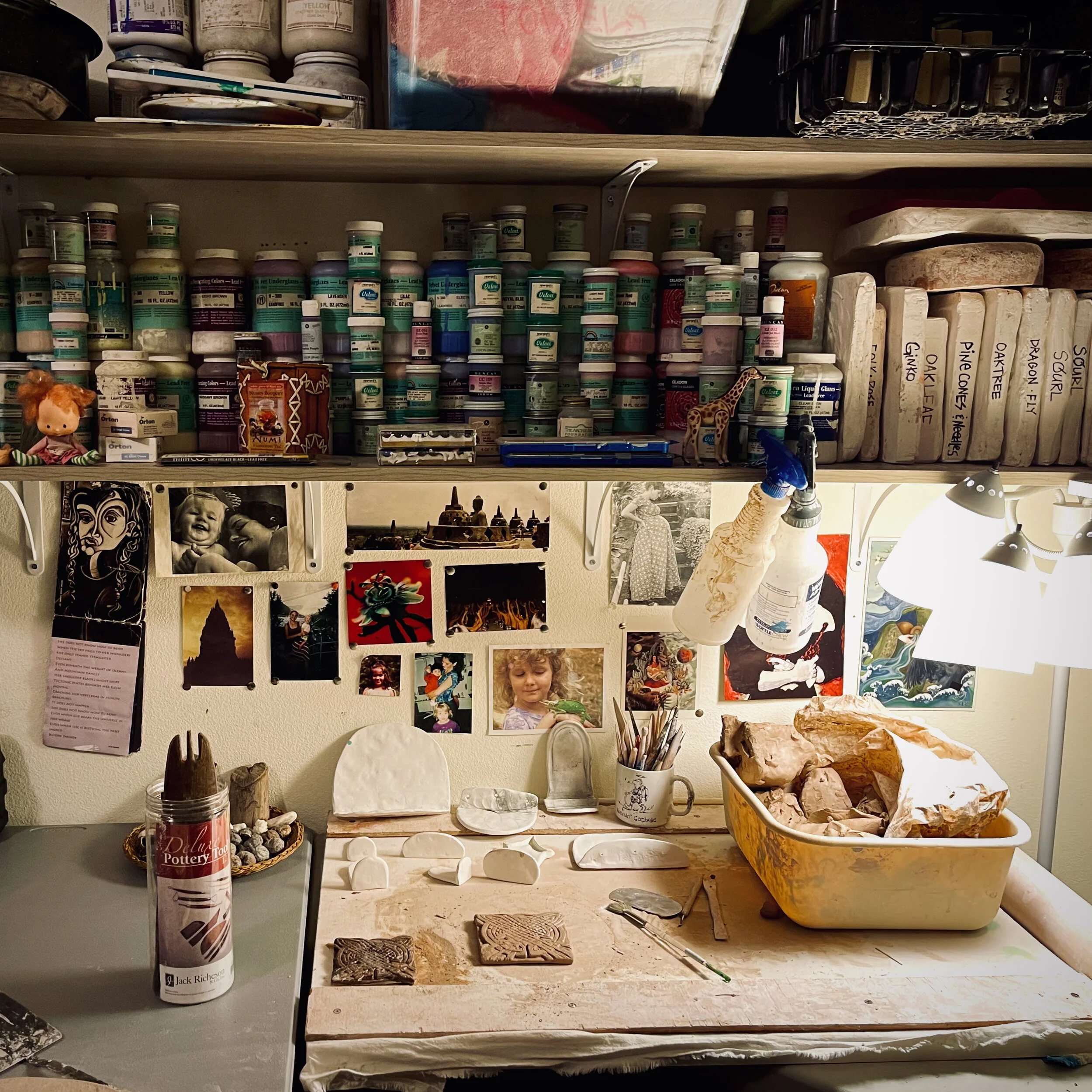 All these little found objects that I have picked up through my travels I definitely have to have. I don’t necessarily use them all the time. I have used them like when I was first making shrine-like pieces. For me it’s really inspiring just playing around with them and I’ll make a clay piece that reminds me of it. If I don’t know what to make, I can dig in here and it’s like my own mini sandbox. I have packed and traveled with these things in like four different states.