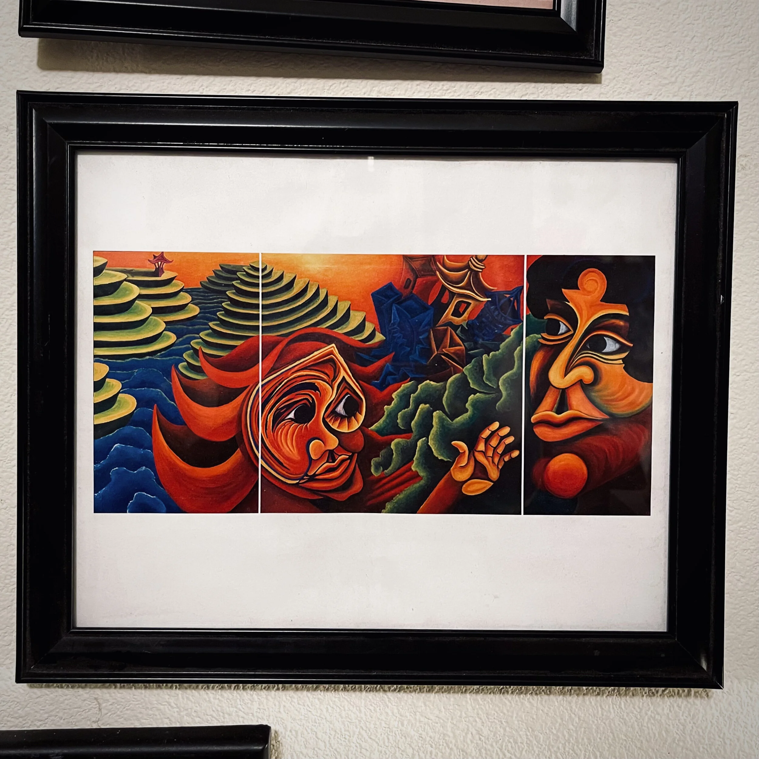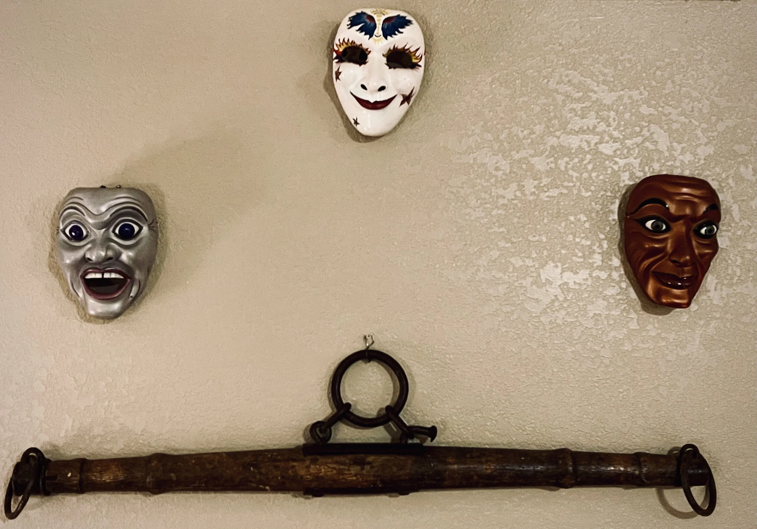 These masks have a whole story that I have told through a dance I choreographed. It is based on a woman's life and the gold represents the sun (young woman). The copper is the earth (mother). The silver is the moon (grandmother). The white is a guardian angel spirit that travels with the woman her whole life. They were all hand carved using only knives and chisels. And then painted. No sandpaper or power tools. The name of this type of mask carving is called Topeng.