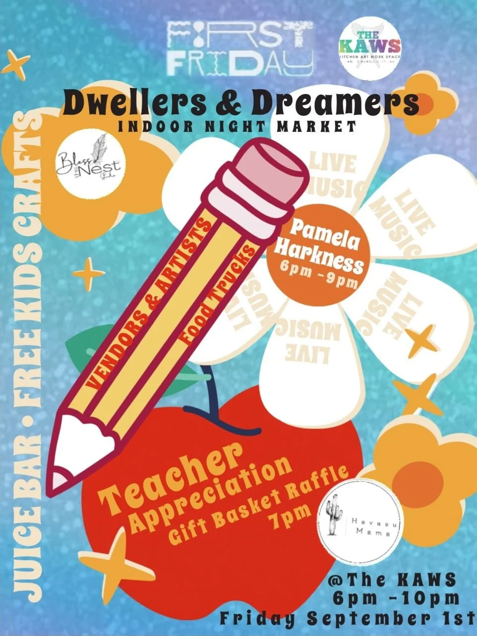 PLUS! You won’t want to miss the action at The KAWS. Featuring live music by Pamela Harkness, vendors, artists, and a raffle for Educators at 7pm!