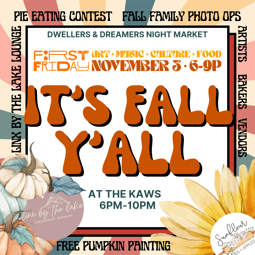 Dwellers & Dreamers Night Market @ The KAWS Dwellers & Dreamers Night Market @ The KAWS6PM-10PM🎧 Live Music w/ DJ TK🥧 Pie eating contest & 📸 Fall Photo Op by SunFlour Pies🍁 Linx by The Lake Fall Lounge🎨 Vendors & Artists🧩 Free Kids Crafts & Games🍕 King of Pizza 🍪 Jwhip Confections 🐟 B&B Bitchin Fish featuredAymie SpitzerOctober 13, 2023nov3 Facebook0 Twitter Pinterest0 0 Likes